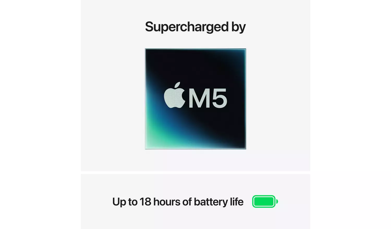 - Supercharged by M5. MacBook Air with the M5 chip brings blazing speed and powerful AI capabilities into an incredibly portable design. With Apple Intelligence. Up to 18 hours of battery life and fast SSD storage starting with 512GB, you can work, create and play anywhere life takes you. SUPERCHARGED BY M5 – With its faster CPU and unified memory, M5 delivers even more performance and fluidity across apps, making multitasking and creative workflows smooth and responsive. A powerful Neural Engine and next-generation GPU with Neural Accelerators give you a powerful platform for AI.